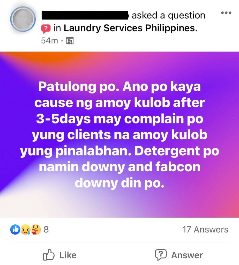 Foul, musty, earthy odor. These are signs of mold or fungal growth or mildew not just on clothes but also walls, carpets, furniture, and interiors of houses which have been kept damp and lacked good air circulation. In the Philippines, they call this odor as “kulob”. Unfortunately, even clothes that have gone through commercial laundry wash and dry can be victims of microorganism growth especially during rainy season, especially if we don’t understand the #ScienceOfCleaning. There are extra steps that need to be taken to preventing malodor.